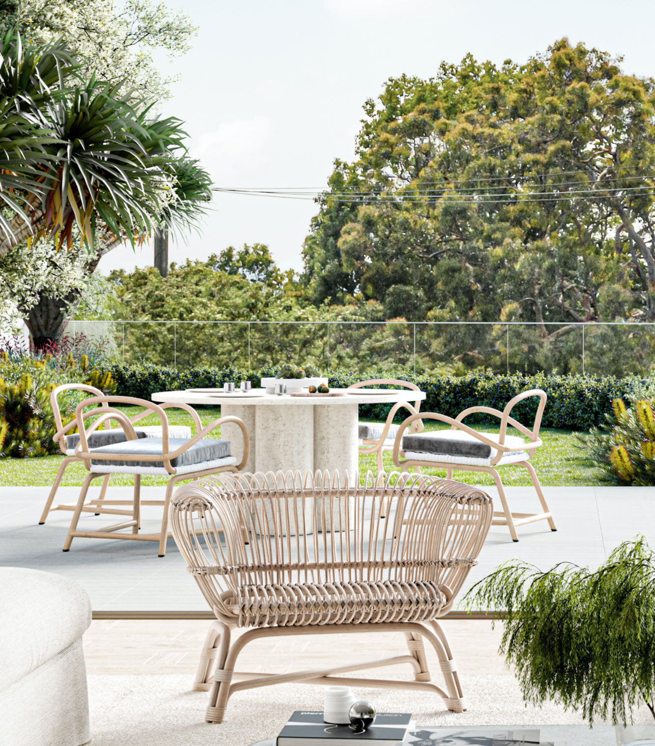 Warm, natural materials such as rendered concrete, neutral bricks and bronze battens imbue the project with a calm, sophisticated quality while floor-to-ceiling glazing and large pivot and stacking doors bring the garden inside the light-filled interiors.